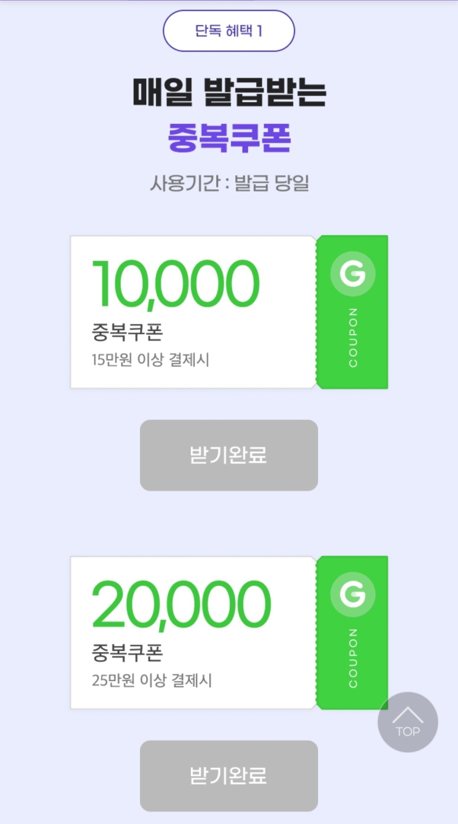- 1만원(15만원 이상 결제시)/2만원(25만원 이상 결제시) 중복쿠폰