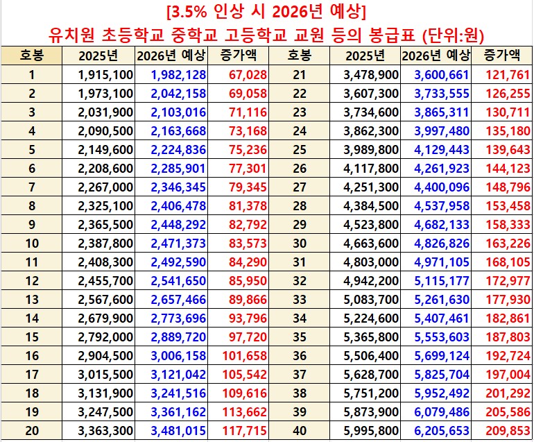 2026년 교원 봉급표 (3.5% 인상 반영)